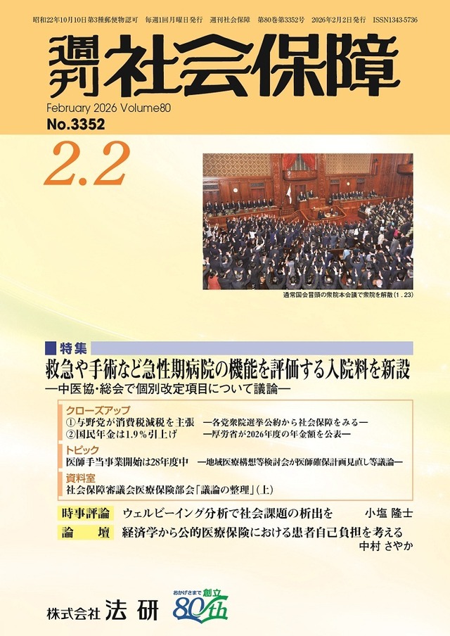 ■特 集 救急や手術など急性期病院の機能を評価する入院料を新設 ―中医協・総会で個別改定項目について議論— ■クローズアップ ①与野党が消費税減税を主張 ―各党衆院選挙公約から社会保障をみる― ②国民年金は1.9%引上げ ―厚労省が2026年度の年金額を公表― ■週間ニュース 社保審・医療部会 ほか ■週間展望 26年度診療報酬改定率を読み解く ■トピック 医師手当事業開始は28年度中 ―地域医療構想等検討会が医師確保計画見直し等議論— ■資料室 社会保障審議会医療保険部会「議論の整理」(上) 2025年12月25日 ■時事評論 ウェルビーイング分析で社会課題の析出を 一橋大学特任教授 小塩 隆士 ■論壇 経済学から公的医療保険における患者自己負担を考える 上智大学教授 中村 さやか ■特別連載 デジタル先進国デンマークの医療保障(第4回) デジタル包摂とデジタルヘルスリテラシー 東海大学健康学部教授 堀 真奈美/Hitomi Vincentzen ■時鐘 消費税減税財源への危惧 ■ひろば ▽特定行為に係る看護師の研修制度 日本看護協会 看護研修学校 課程長 渋谷 智恵 ▽セルフケア・セルフメディケーションの推進に向けて 日本 OTC 医薬品協会 理事長 磯部 総一郎 ▽アプリを活用したニーズと資源のマッチング(さいたま市) 「健康寿命をのばそう!アワード」受賞事例から ■ニュース・アラカルト ■この一冊 『グローバル・ヘルスと持続可能な社会』 小林 尚行 著 ■門前雀羅25 日本の医療費は国際的にみて高いのか? 佐藤 敏信 ■年金相談のトビラ 第128回 事業主の保険料滞納等と年金額への影響 佐竹 康男 ■OECD レポート2026(第4回) パーソナルヘルスデータの利活用 佐藤 文 ■DATA ROOM 最近の医療費の動向(2025年5月診療分) ■編集室から ※配送は日本国内に限ります。 海外配送は承っておりませんのでご了承願います。 ※お客様都合によるご注文のキャンセル・返品は 原則として承っておりません。 購入内容をよくお確かめのうえ、お申し込みください。
