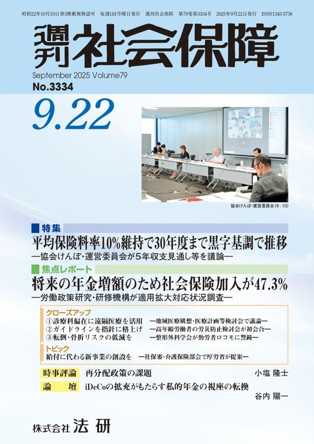 ■特集 平均保険料率10%維持で30年度まで黒字基調で推移 ―協会けんぽ・運営委員会が5年収支見通し等を議論― ■焦点レポート 将来の年金増額のため社会保険加入が47.3% ―労働政策研究・研修機構が適用拡大対応状況調査― ■クローズアップ ①診療科偏在に遠隔医療を活用 ―地域医療構想・医療計画等検討会で議論― ②ガイドラインを指針に格上げ ―高年齢労働者の労災防止検討会が初会合― ③転倒・骨折リスクの低減を ―整形外科学会が勤労者ロコモに警鐘― ■週間ニュース 中医協・総会 ほか ■週間展望 年金をめぐる若者の思いと理解 ■トピック 給付に代わる新事業の創設を ―社保審・介護保険部会で厚労省が提案― ■時事評論 再分配政策の課題 一橋大学特任教授 小塩 隆士 ■論壇 iDeCoの拡充がもたらす私的年金の視座の転換 名古屋経済大学教授 谷内 陽一 ■時鐘 年金制度と子ども・子育て支援 ■ひろば ▽高齢者の食事の重要性と診療報酬 日本病院会 常任理事 小阪 真二 ▽投資による資産形成と公的年金 年金シニアプラン総合研究機構 専務理事 板谷 英彦 ▽3歳児健診における弱視の早期発見(群馬県) 「健康寿命をのばそう!アワード」受賞事例から ■ニュース・アラカルト ■この一冊 『えっ!死ぬとか生きるとか、知事命令?』 ■射影子68 江戸の蘭学者と森嶋予想 井口 直樹 ■年金相談のトビラ 第112回 配偶者加給年金と振替加算の手続き 三宅 明彦 ■インドネシア KAIGO プロジェクト(第5回) 人材の帰国後/プロジェクトの横展開 米丸 聡 ■DATA ROOM 後期高齢者医療費速報(2025年1月診療分) ■編集室から ※配送は日本国内に限ります。 海外配送は承っておりませんのでご了承願います。 ※お客様都合によるご注文のキャンセル・返品は 原則として承っておりません。 購入内容をよくお確かめのうえ、お申し込みください。