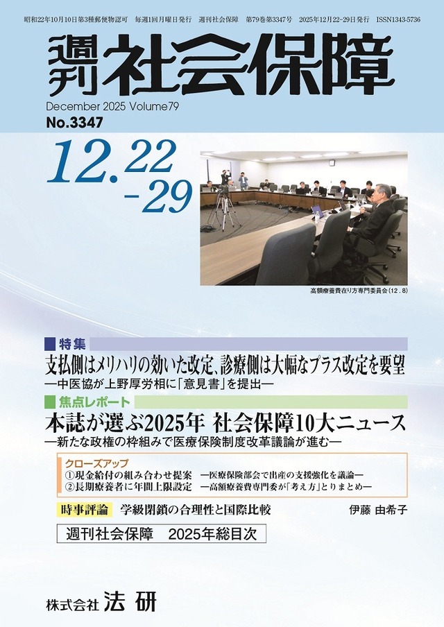 ■特集 分娩対応を現物給付化し全国一律の給付水準に ―社保審・医療保険部会で制度改革等を議論— ■クローズアップ ①保険料負担の抑制努力を継続 ―財政審が26年度予算編成の建議提出― ②糖尿病有病者は1100万人 ―24年国民健康・栄養調査を公表― ■週間ニュース 医療法等改正法成立 ほか ■週間展望 結果はどうなる? ■トピック1 薬価の平均乖離率は4.8% ―中医協・総会で25年度薬価調査結果を聴取— ■トピック2 2割負担の対象範囲拡大を ―介護保険部会に検討の方向性を提示— ■寄稿 社会保障負担と経済活動との関係(下) 日本介護経営学会理事 宇野 裕 ■時事評論 介護保険のこれまでと見直し議論 立正大学教授 西村 淳 ■論壇 「ケアの金融化」とは何か 東京大学大学院准教授 米澤 旦 ■時鐘 小規模企業への適用拡大支援 ■ひろば ▽人生100年の過ごし方 日本歯科医師会 専務理事 伊藤 智加 ▽医療安全情報の提供について 医療機能評価機構 医療事故防止事業部 井上 純子 ▽未来のあんしんに向けた終活支援 静岡市 保健福祉長寿局理事 内舘 友理 ■ニュース・アラカルト ■射影子69 パリの「おにぎり」人気 井口 直樹 ■社会保障Q&A 育児・介護休業法の改正について 安田 武晴 ■年金相談のトビラ 第124回 婚姻期間の長さと配偶者加給年金 中島 文之 ■OECDレポート2025(第39回) 国際移民アウトルック2025② 駒田 直之 ■DATA ROOM 後期高齢者医療費速報(2025年4月診療分) ■編集室から ※配送は日本国内に限ります。 海外配送は承っておりませんのでご了承願います。 ※お客様都合によるご注文のキャンセル・返品は 原則として承っておりません。 購入内容をよくお確かめのうえ、お申し込みください。